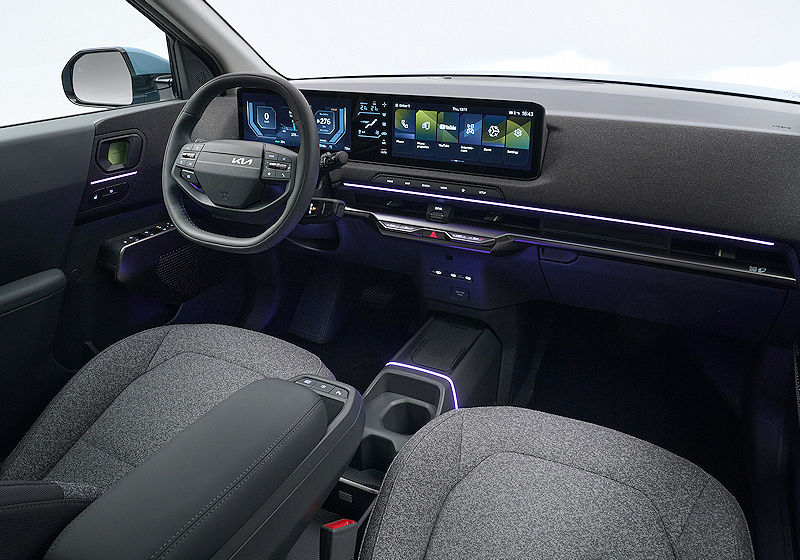 Im Fokus steht das breite Panoramadisplay: digitales Kombiinstrument und Navigationsscreen (je 12,3 Zoll) werden durch einen separaten Touchscreen für die Klimasteuerung ergänzt. Zum Einsatz kommt erstmals die neue ccNC-Lite-Version des Kia-Infotainmentsystems. Sie verzichtet auf eine Festplattennavigation, bietet aber kabelloses Android Auto™ und Apple CarPlay™, OTA-Updates sowie Upgrades über den Kia Connect Store.