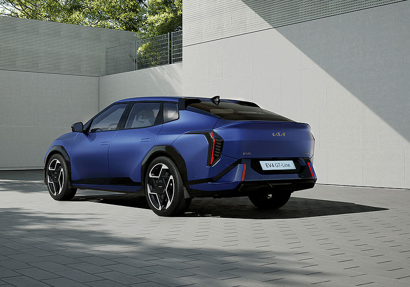 In der Ausführung GT-line verfügen beide Karosserievarianten über zusätzliche exklusive Designelemente, die sie noch dynamischer machen. Die flügelförmigen Stoßfänger vorne und hinten lassen den Kia EV4 kraftvoller und geschmeidiger wirken, während die 19-Zoll-Räder mit Dreiecksmotiv dessen futuristischen, sportlichen Charakter unterstreichen.