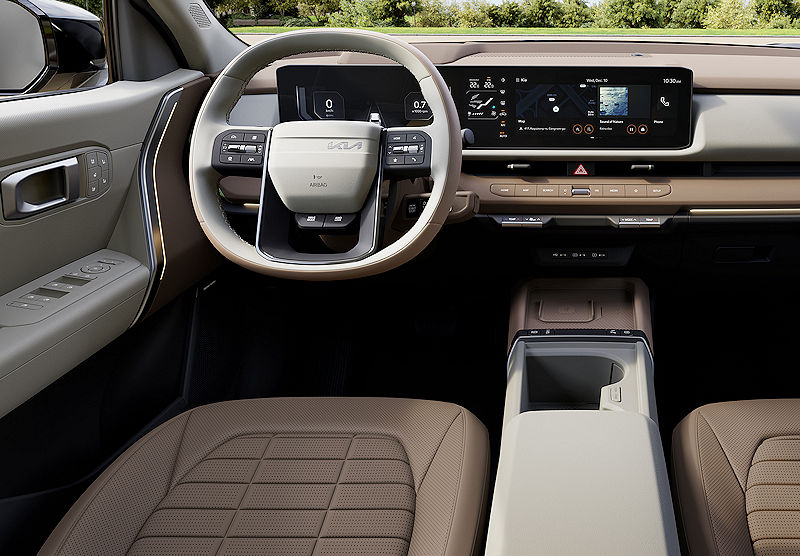 Auch innen hat Kia kräftig nachgelegt und den Seltos konsequent auf die Anforderungen moderner Mobilität zugeschnitten, ganz gleich ob im täglichen Pendelverkehr, auf längeren Familienfahrten oder beim spontanen Wochenendtrip ins Grüne. Ein niedrig gestaltetes Armaturenbrett mit horizontaler Linienführung öffnet den Blick nach vorn und vermittelt ein luftiges Raumgefühl, während die neu strukturierte Raumaufteilung allen Insassen großzügige Kopf- und Beinfreiheit bietet. Der Gangwahlhebel ist nun als Shift-by-Wire-Lösung direkt am Lenkrad positioniert, was Platz schafft und die Mittelkonsole aufgeräumter wirken lässt, unterstützt von hochwertigen Materialien und einem klaren, modernen Layout.