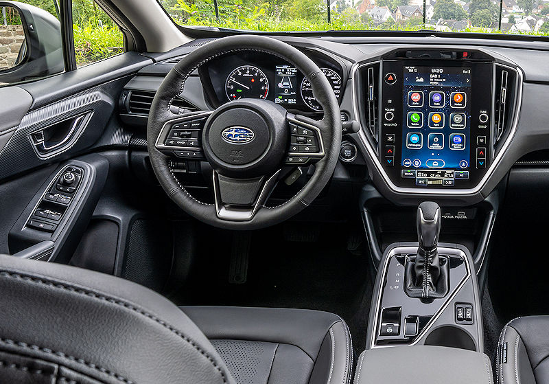 Auch was die Serienausstattung betrifft, zeigt sich der Crosstrek großzügig. Bereits ab Werk an Bord: ein 11,6 Zoll großer Touchscreen, über den das Infotainment samt DAB+, Apple CarPlay, Android Auto, sechs Lautsprechern und zwei USB-Anschlüssen gesteuert wird. Dazu gibt’s eine digitale 4,2-Zoll-Instrumentenanzeige, elektrisch einstell-, anklapp- und beheizbare Außenspiegel, Sitzheizung vorne, Rückfahrkamera, LED-Beleuchtung rundum, 17-Zoll-Leichtmetallfelgen, sowie Licht- und Regensensor.