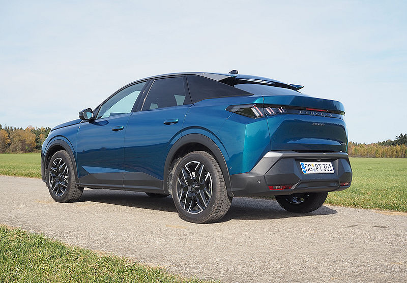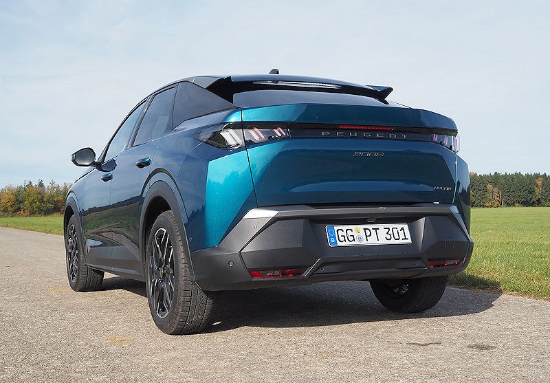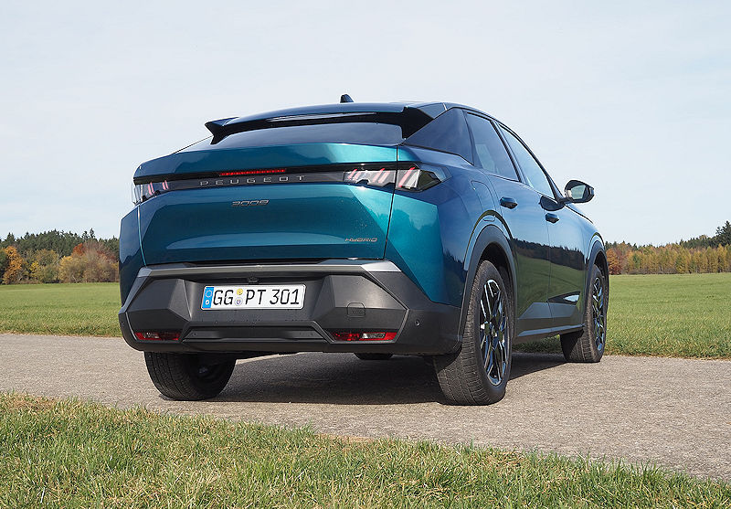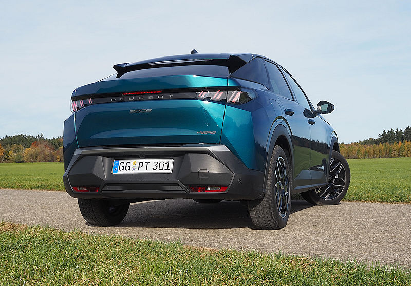 Mit seinen ausgewogenen Abmessungen (4,54 m Länge, 1,89 m Breite, 1,64 m Höhe) bleibt der 3008 eines der kompaktesten Modelle im elektrifizierten C-SUV-Segment – wirkt aber optisch präsenter, selbstbewusster, beinahe schon athletisch. Verantwortlich dafür ist vor allem die neue Fastback-Silhouette. Peugeot hat die klassische Fließhecklinie neu interpretiert und mit einem „schwebenden“ Spoiler am Heck modernisiert. Dieses Design-Detail verschärft nicht nur die Dynamik des Profils, sondern verbessert gleichzeitig die Aerodynamik.